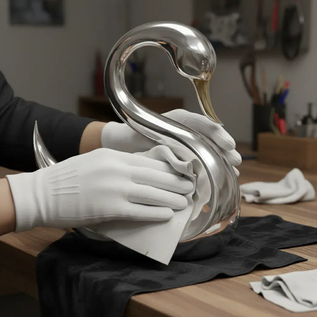 Тихая роскошь — когда сияние не требует усилий. Мыло + тёплая вода + мягкая салфетка. Для не покрытых родием и не оксидированных моделей можно аккуратно пройтись серебряной салфеткой. Если не помогло — профессиональная чистка.